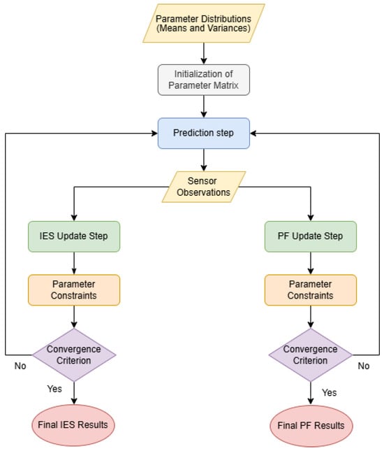 During the initialisation phase, common to both the IES and PF methods, the parameter matrix is constructed. Each column of , denoted as , represents the parameter vector for ensemble member j at iteration k in the IES method, or particle j in the PF method. These columns are sampled from assumed parameter distributions, ensuring that the ensemble (or set of particles) reflects the uncertainty in the system’s initial conditions.