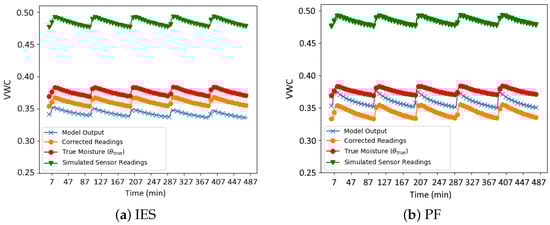 where and are the estimation of calibration parameters. This correction adjusts the sensor observations to account for the identified biases, yielding more accurate estimates of VWC.