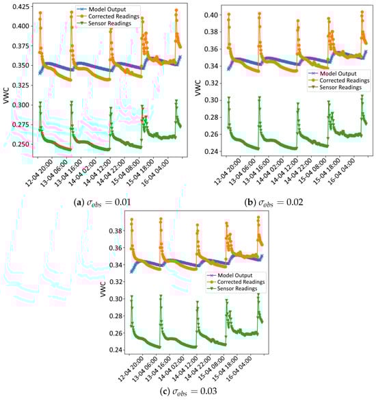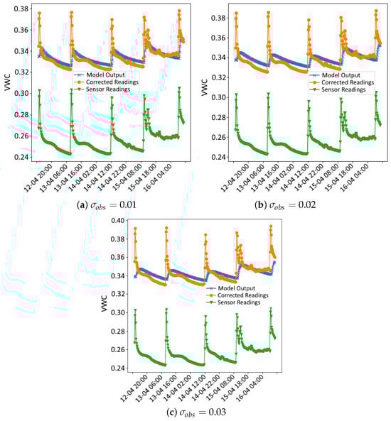 The outcomes of the data assimilation process are illustrated in a series of figures. Figure 3 and Figure 4 illustrate the data used in the assimilation process for both methods for values of 0.01, 0.02 and 0.03, respectively, and r = 100, as an example. In each figure, three time series are plotted: the sensor readings (green), the corrected readings () using the calibration coefficients from the data assimilation process (orange) and the VWC time series simulated by the Hydrus model using the hydraulic parameters obtained in the data assimilation process (blue).