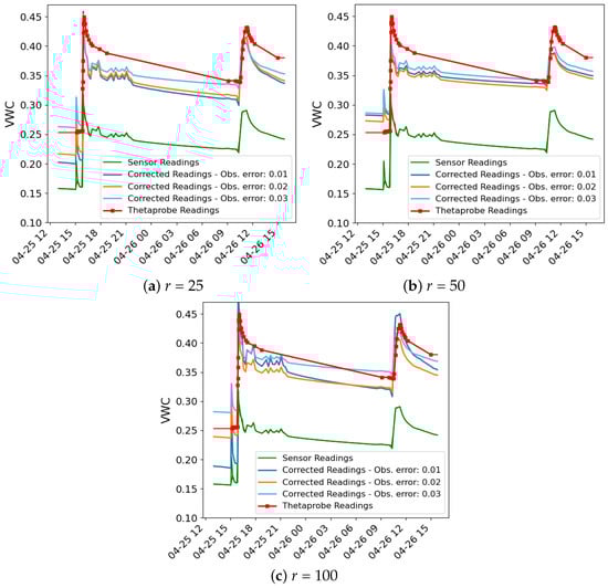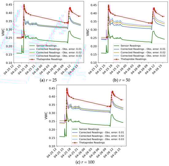 Figure 5 and Figure 6 show the time series of moisture from the sensor readings, the ThetaProbe sensor readings and the corrected readings for both methods, with different values of r and . As can be observed, the sensor readings show a significant bias compared to those of the ThetaProbe. In all cases, the corrected readings are closer to the ThetaProbe readings.