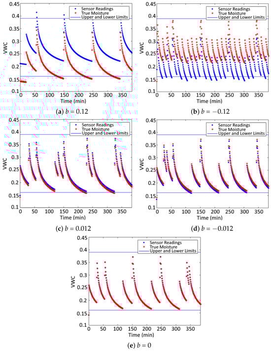 In Figure 7, the time series of both the true moisture (b = 0) and the simulated sensor readings for the different cases analysed are shown, as well as the minimum and maximum moisture limits. In Figure 7a, it is observed that the moisture level falls below the minimum threshold during significant periods, potentially causing water stress in the crops. In Figure 7b, an excessive number of moisture peaks related to motor start-ups can be seen. It is also observed that the moisture levels remain relatively higher for longer periods. In Figure 7c,d, the cases with corrected measurements are shown, where the irrigation patterns and strategy are quite similar to the optimal case in Figure 7e.