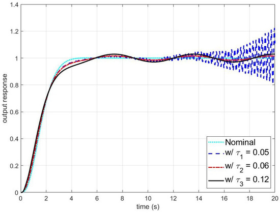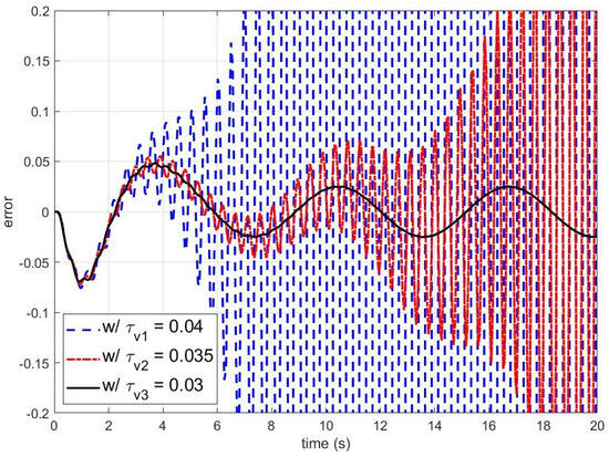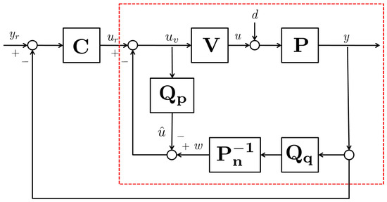 Remark 1. When the dynamics of Q-filter is much faster than the unmodeled dynamics v (i.e., ), the stability of the overall closed-loop system is not guaranteed. Since , the dynamics of Q-filter are considered as fast dynamics. Then, from (17) and (18), the system matrix of ξ and ζ becomesand always has one eigenvalue at the origin. Therefore, the singular perturbation theory cannot be employed since the boundary-layer system is not exponentially stable. In fact, if the relative degree of v-dynamics is greater than one, then robust stabilization is impossible when the time constant is much smaller than [43]. 4. Nominal Performance Recovery by Disturbance Observer Under Unmodeled Dynamics