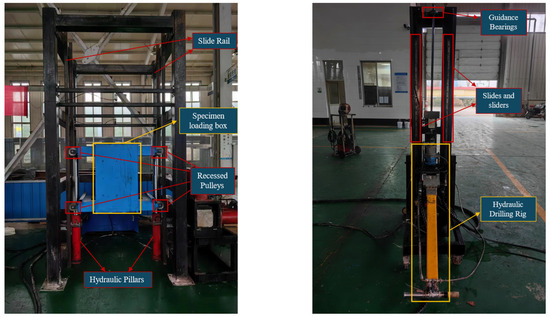 The laboratory testing platform, shown in Figure 1, includes a specimen-loading box that accommodates multiple specimen sets. The box is raised and lowered by two hydraulic props positioned on either side, supported by grooved pulleys and slide rails. A hydraulic anchor drilling rig (model MYT-140/320 I) was chosen to simulate underground roof bolt hole construction conditions. The drilling rig is fixed onto a support frame equipped with a slideway and slider along the drilling direction. A guide bearing is installed at the top of the drill rod to ensure that the movement trajectories of the drilling rig and drill rod remain stable during drilling, avoiding significant deviations that could affect the drilling process and data acquisition.