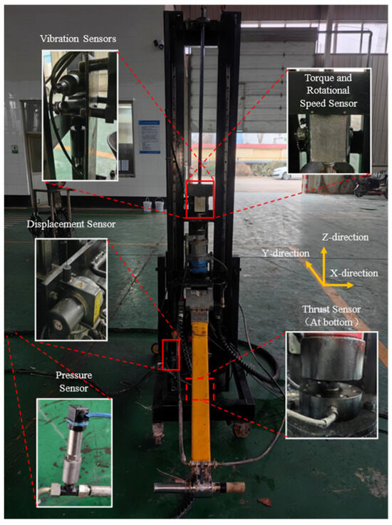 Five types of sensors—measuring the drill thrust, drill rod rotation speed, drill rod torque, three-axis vibration velocity, and hydraulic pipeline pressure—were used to monitor the key parameters in real time during the drilling process. Additionally, a cable displacement sensor was used to indirectly obtain the drilling speed parameter of the rig.
