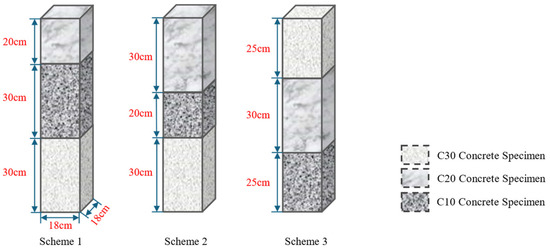 - Scheme 1: The lower section is a 30 cm C30 concrete specimen, the middle section is a 30 cm C10 concrete specimen, and the upper section is a 20 cm C20 concrete specimen, with a total height of 80 cm;