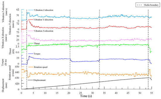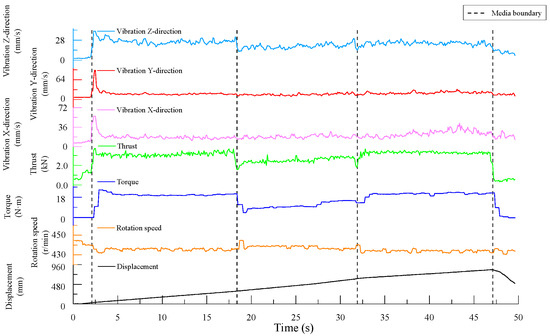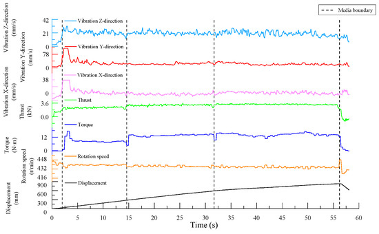 At the interfaces between different media, the torque signal exhibits distinct vertical lines spanning the entire frequency domain in the time–frequency representation, indicating clear signal characteristics. The thrust signal also displays vertical lines across multiple frequencies at these interfaces, though its features are less pronounced compared to the torque signal. In contrast, the time–frequency results of the z-axis vibration velocity data are more mixed, with unclear signal characteristics.