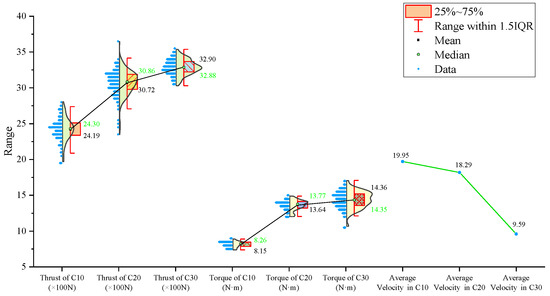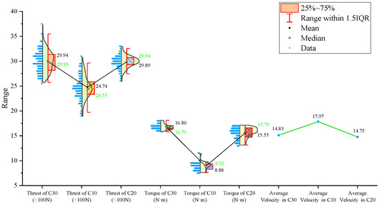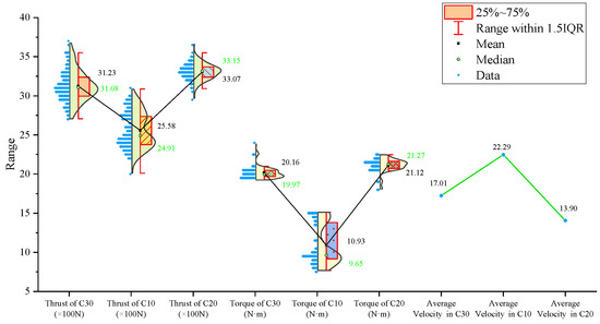 The signal statistics are presented in Figure 13, Figure 14 and Figure 15. Similar to the previous two experiment groups, the drilling speed in the lowest-strength C10 concrete was the fastest. The mean, median, and primary distribution ranges of both the thrust and torque are the smallest for the C10 specimen. The average thrust and torque also follow the same trend, increasing as the strength of the drilled medium increases.