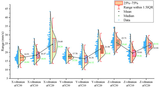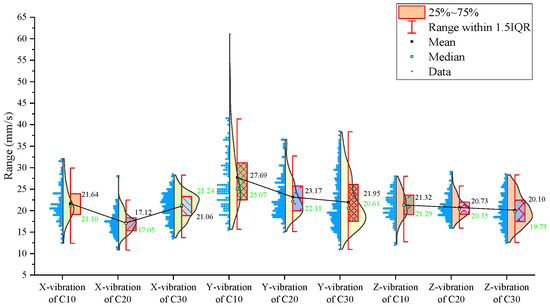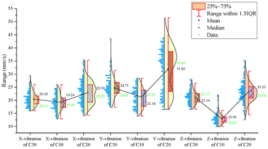 Regarding the three-axis vibration data, the mean and median vibration velocities in the x-, y-, and z-directions are the lowest in the specimen with the lowest strength (the C10 concrete). The standard deviations of the vibration velocity in the y- and z-directions are also the smallest in the C10 concrete.