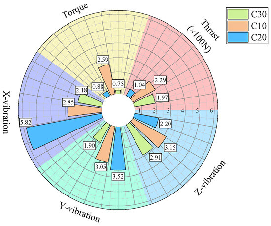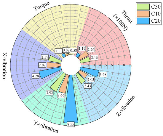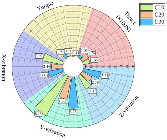 Considering the data from all three experimental groups, the average values were calculated, with the results presented in Table 3. From the averaged data, it can be observed that in the lowest-strength C10 concrete, the centroid frequency of the thrust and torque signals is lower than that of the higher-strength specimens. Moreover, the waveform factor, impulse factor, peak factor, and margin factor of the torque, thrust, and z-axis vibration velocity signals are higher in the C10 concrete compared to the stronger specimens. However, the differences in the values of these dimensionless indicators are not particularly significant.