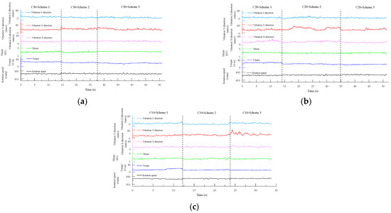 To more comprehensively analyze and compare the drilling signal characteristics of the different-strength concretes during the drilling process, and to investigate whether the drilling signal parameters of the same-strength concretes in different experimental groups were consistent and reliable, the stable drilling signal data from each concrete specimen in the three experimental groups were concatenated, as shown in Figure 16.