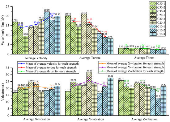 As shown in the statistical results in Figure 17, for the C10 concrete, the specimen was positioned in the middle layer in the first two experiments, whereas in the third experiment, it was located at the bottom of the specimen stack and was the first to be drilled. During the initial contact between the drill bit and the C10 concrete specimen, substantial overall vibration was generated. As a result, the mean vibration velocities in the non-axial directions were higher than those observed when the C10 specimen was in the middle layer in the previous two experiments.