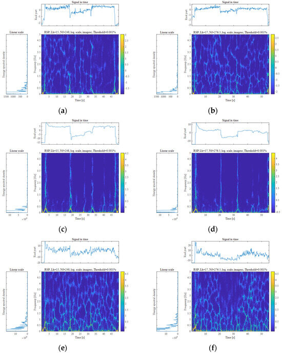 The Reassigned Short-Time Fourier Transform (RSTFT) [27,28,29,30] is an improved version of the Short-Time Fourier Transform (STFT) [31,32,33,34], which achieves higher time–frequency resolution by reassigning the power within the time–frequency spectrum to more precise time and frequency locations. The RSTFT first applies a standard STFT to the signal, generating an initial time–frequency spectrum. Then, by calculating the local phase derivatives at each time–frequency point, it determines more accurate time and frequency coordinates and reassigns the power at that point to these precise locations. This process concentrates the otherwise blurred power density, resulting in a clearer frequency distribution, significantly enhancing the resolution of the time–frequency spectrum and effectively reducing frequency blurring.