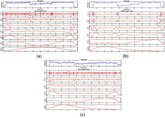 Empirical mode decomposition (EMD) [35,36,37] is a time–frequency analysis method designed for processing nonlinear and non-stationary signals. It adaptively decomposes complex signals into several simpler, physically meaningful sub-signals known as Intrinsic Mode Functions (IMFs). Each IMF represents a specific frequency component of the original signal, and these components are arranged in descending order of frequency. This decomposition allows for a detailed examination of the signal’s structure and can reveal underlying patterns that may not be apparent in the raw data.