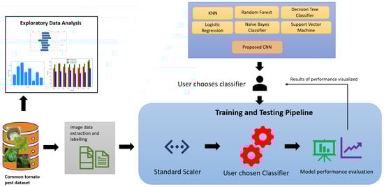 Classifying tomato pests using images involves integrating various components, including data collection, pre-processing, model development, training, and evaluation. Figure 1 shows the overview of tomato pest classification using the machine and deep learning approach. By following the system overview of tomato pest classification, researchers and practitioners can develop a robust and automated solution for classifying tomato pests using images.