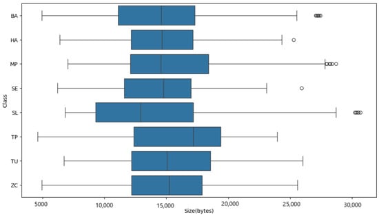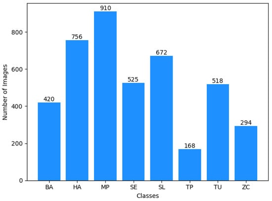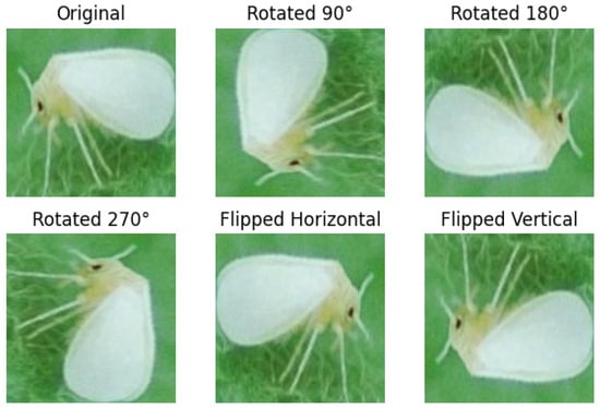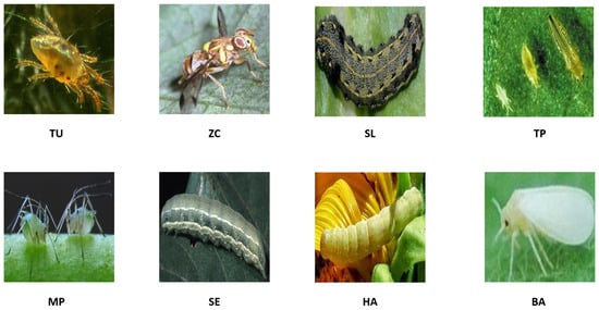 The system begins by collecting a diverse dataset of tomato pest images. We used a database of eight common tomato crop pests developed by the authors of [72]. The dataset included eight pest classes, which are as follows: (1) Spider mites (Tetranychus urticae)—TU, (2) Whitefly (Bemisia argentifolii)—BA, (3) Melon fruit fly (Zeugodacus cucurbitae)—ZA, (4) Melon trhips (Thrips palmi)—TP, (5) Green peach aphid (Myzus persicae)—MP, (6) Tobacco cutworm (Spodoptera litura)—SL, (7) Beet armyworm (Spodoptera exigua)—SE, and (8) Fruit borer (Helicoverpa armigera) HA. The dataset is annotated with labels of specific pests in each image. The image repository comprises 609 original images categorized into eight distinct groups. The database was augmented by applying image enhancement techniques, such as rotation (90°, 180°, 270°), flip (horizontal and vertical), and cropping, resulting in 4263 images (Figure 2). Standardization procedures were employed to unify the dimensions of all images to 299 × 299 pixels, with the file standardized to JPG format. This database serves as a comprehensive collection of visual data, aiding researchers and practitioners in studying and understanding various tomato pest species [73,74,75,76].