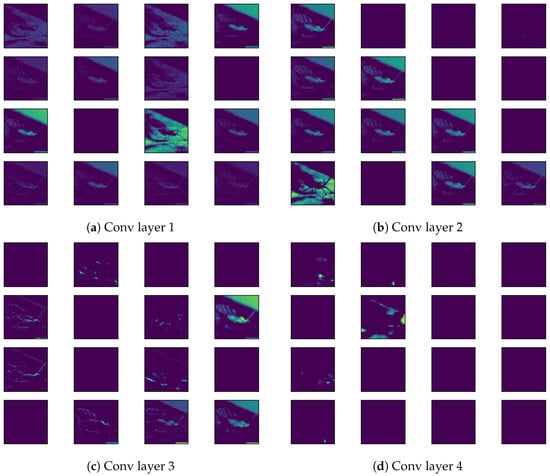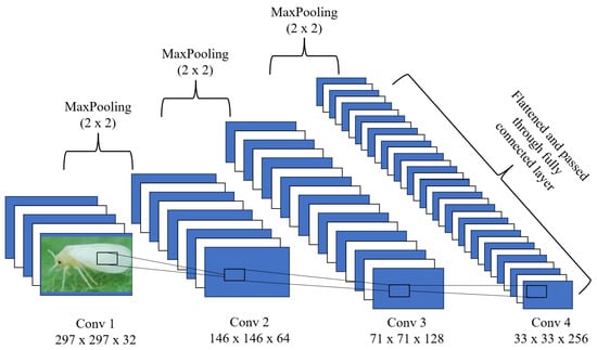 The first convolutional layer processes the input image of size 297 × 297 × 1 using 32 filters, each with a size of 3 × 3 with 320 trainable parameters (Table 1). This is followed by a max-pooling layer with a kernel size of 2 × 2 (Figure 3). The second convolutional layer employs 64 filters of size 3 × 3 with 18,496 trainable parameters (Table 1), followed by another max-pooling layer. The third and fourth convolutional layers utilize 128 and 256 size 3 × 3 filters, respectively having 295,168 trainable parameters. Each convolutional layer uses the Rectified Linear Unit (ReLU) activation function to prevent the vanishing gradients problem during backpropagation. The ReLU function is defined as: