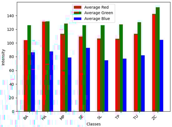 A series of experiments are conducted to investigate the classification of tomato pests using images and the impact of different optimizers on model performance. Our study uses a database of eight common tomato crop pests [72], as shown in Figure 4. A total of 4263 images are collected from the database, and the sample class-wise distribution is shown in Figure 5. The tomato pest dataset is imbalanced, and we do not consider balancing the dataset using oversampling in our work. Class TP has the most minor images, around 168, and class MP has the highest number, around 910. The size of images in bytes is plotted classwise in Figure 6, which shows that most classes have images of around 15,000 bytes except for class SL, which has an image size of around 13,000. The RGB intensity distribution shown in Figure 7 implies that every class has high green intensity images as the background is tomato leaves. However, this is irrelevant to our work as we convert the images to grayscale. The images are 299 × 299 × 3 dimensions, converted to 297 × 297 × 1 (grayscale) and passed into the training and testing pipeline that standardizes the image pixel values to avoid exploding gradient problems and easy computation. The machine learning models are trained on Google Colab processor Intel(R) Xenon (R) images with 2 CPU cores, 2.30 GHz CPU frequency, and 12 GB RAM. Sklearn version 1.2.2 [77] is used for all model training and testing of the tomato pest dataset. The following subsection discusses our experiment results based on machine learning models and the impact of different optimizers in a CNN model for classifying tomato pests and comparison with state-of-the-art deep learning models.