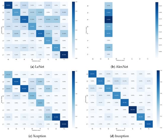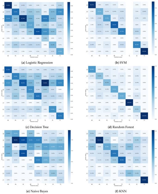 Logistic regression is commonly used for binary classification. However, we implemented logistic regression using a one-versus-rest class strategy with a cross-entropy as a loss function with maximum iterations of 1000 and penalty as none [77]. The results show that the logistic regression has reached an accuracy of 32% with precision, recall, and F1 scores of around 30% (Table 2). The AUC score for logistic regression reached 0.66. For the SVM classifier, we implemented Sklearn’s SVM with ‘rbf’ as the kernel. The SVM fits a plane through data points to classify all classes, which is considered a better non-linear model for classification. The accuracy of SVM on the tomato pest dataset is 41%, and precision, recall, and F1 scores ranged between 45 and 35%. The average AUC score of SVM is 0.81. SVMs are not accurate for imbalanced datasets. Cross-validation techniques or over-sampling can be performed to reduce this impartial classification. Decision tree classifiers follow simple rules inferred from data points that are unsuitable for image data, as the image data are complex and difficult to generalize for models. We have set the depth of the tree as default, i.e., all the possible depths of the decision tree to fit the image data are explored. The decision tree classifier has resulted in an accuracy of 31%, with precision, recall, and F1 score of around 29% (Table 2). Random forest is an ensemble classifier consisting of multiple decision trees. It uses averaging over prediction to reduce overfitting. This classifier achieved the highest accuracy of 46%, precision of 60%, recall of 38%, F1 score of 42%, and the average AUC score of 0.81. Random forest is the best-fitted model under the mentioned experimental conditions, but it still needs thorough hyperparameter tuning and analysis to be finalized. The model can easily handle complex relationships and non-linearity. The naive Bayes machine learning model is well known for text classification tasks and uses the probability of classes instead of features to predict each class image based on the Bayes theorem. The naive Bayes classifier assumes that the images of each class are independent, which is highly violated in real-life scenarios; this makes the classifier perform poorly on image classification. Therefore, a significantly poor performance was observed with a maximum accuracy of 14%. The k-nearest neighbors classifier uses the ‘k’ nearest neighbors of each data point to classify or cluster those nearest points together into a class. We used the KNN classifier from [77] with k = 5. It showed an accuracy of 31%, precision of 28%, 27% recall, F1 score of 27%, and an AUC score of 0.68. Furthermore, we analyzed the performance of each machine learning model based on the confusion matrix, which is shown in Figure 8.