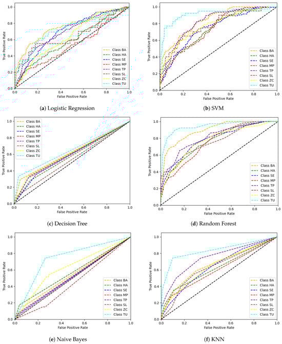 Next, we investigated the classification performance of machine learning models based on the ROC curve, which is useful information when the dataset has a class imbalance. Figure 9 shows the ROC curves of multiple machine learning models for tomato pest classification. The ROC curve for the logistic regression model shows that the BA class true positives are correctly classified compared to other classes, while class MP has the lowest classification rate. The SVM ROC curve shows that class TU has a high true positive and false negative rate. Class MP has the lowest classification rate, but the rate of classification by SVM shows better performance than other models. In contrast, the confusion matrix results show that it has struggled due to the imbalanced sample distribution of the dataset. The ROC curve of the decision tree model indicates that class TU has a high correct classification rate and class SL has the lowest classification rate. The ROC curve describes the decision tree classifier has a poor discrimination ability to classify positive and negative instances due to the class imbalance from the tomato pest dataset. The ROC curve for random forest demonstrates that class TU is more correctly classified, while class SL has the lowest classification rate, along with class MP. The ROC behavior of random forest hints at a non-linear relationship between the instances and possible model overfitting. The ROC curve for the naive Bayes classifier shows that the classification rate is significantly less, and class SL is under the baseline of random guess classification. This behavior is highly undesirable as the model struggles to differentiate between positive and negative instances from a random guess scenario. The ROC curve of the KNN classifier validates that class TU has a high positive/negative classification rate while class MP has the lowest classification rate. The ROC curve behavior suggests that the model struggles to differentiate between positive and negative instances of each class.