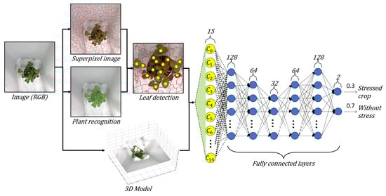 We propose a methodology for plant stress detection using 3D reconstruction and deep learning from a single RGB image. Our approach is to predict plant stress by leveraging its three-dimensional geometry, which we achieve by combining the abstraction power of deep learning with information about the plant’s height and 3D structure. This work brings the best of the two worlds to address the problem of plant stress. The methodology consists of three steps. First, we use plant recognition to segment, localize, and delimit the crop (Section 3.1). Second, we apply leaf detection analysis to classify and find the boundaries between leaves (Section 3.2). Finally, we use a Deep Neural Network (DNN) and the 3D reconstruction for plant stress detection (Section 3.3). Figure 1 shows the schematic representation of the proposal.