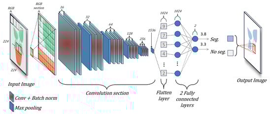The input of the CNN is an RGB section with a size of 32 × 32 pixels. Our network contains two stages. The first stage of the network (encoder) is based on the VGG16 architecture [44]. We use this encoder since it has promising results to obtain the feature map for the object classification tasks [45,46]. The first stage consists of 13 convolutional, 13 batch normalization, and 5 max pooling layers, which extract feature maps with different resolutions from the input image. This stage is the backbone of the network since the extracted features are shared in the second stage. The second stage combines all the found local features of the previous convolutional layers. We use a flatten layer, dense layers, and batch normalization. Finally, we use a second dense layer to obtain a label of the two possible labels (crop and no-crop ). Figure 2 shows the architecture of our CNN for semantic segmentation.