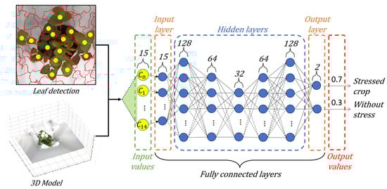 Our DNN has an input layer consisting of fifteen neurons. These neurons use the characteristic vector , which corresponds to fifteen centroids of the 3D leaf. Then, the hidden layers adjust the weights between the neural connections to perform predictions to minimize the difference to the correct labels. This allows the DNN to learn and adapt to the complexity of the input data. The output layer consists of two neurons that classify the plant stress using a sigmoid activation function.