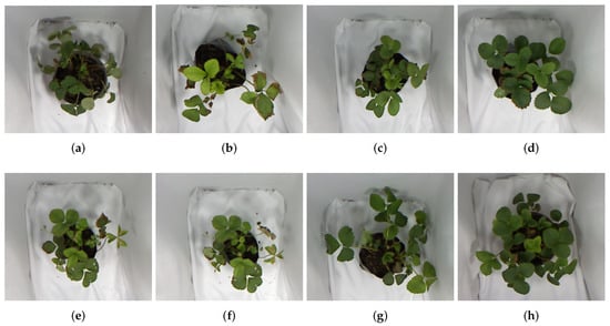 Figure 5e shows a plant with excess water and nutrient (Group E). The expert observed yellow leaves, burn edges, and blue–green leaves due to excess phosphorus and twisting of the leaves. Figure 5f shows a plant with water and nutrient deficits (Group F). The expert observed necrosis in the tissue of the leaves, twisting of the leaves, short lateral branches, and darker leaves. Figure 5g shows a plant with moderate water and nutrient stress (Group G). The expert observed firm stems and leaf growth. However, some leaves turned downward, with dark green and brown coloration, by phosphorus deficiency. Figure 5h shows a plant without water and nutrient stress (Group H). The expert observed the greatest leaf growth. Also, the leaves looked firm with green color by adequate photosynthetic activity. The stems remained firm and without leaf loss due to nitrogen and phosphorus. In our experiments, plants took up to 4 days to exhibit visual indicators, such as changes in color, texture, and physical alterations in the leaves.