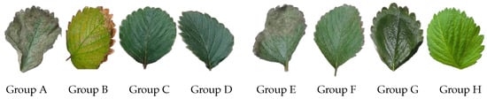 We use a dry weight analysis to revalidate the stress detection in our strawberry plants dataset. This analysis is the weight recorded after drying plant tissue at temperatures higher than ambient temperature. This drying process eliminates water from the plant. The water is extracted from plant leaves until the water content is reduced to 0% using a surrounding air current. During the process, the sample sheet is weighed to obtain the drying curve that shows the Moisture Ratio (MR) over time [50,51]. Also, this analysis was used in previous works to detect stressed plants [52,53]. Figure 6 shows the leaves of our eight sets with plant stress phenotyping (A, B, C, D, E, F, G, H).