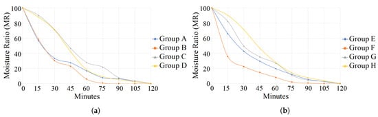 where denotes the humidity at time t, the initial humidity, and the equilibrium humidity. Table 3 shows the behavior of the dry weight in our eight sets of plants (A, B, C, D, E, F, G, H). Also, the results in bold refer to losing moisture slower. In the first 30 min, the leaves with excess water (Group A) and water deficit (Group B) similarly lost moisture. The leaves of group A lost all their humidity after 120 min, while the leaves of group B did so after 75 min. In this case, the drying time is longer in the leaves of plants with excess water. Group C leaves lost 10% of their moisture at 15 min, and at 75 min, they still retained 22%. The leaves of Group D with moderate stress had similar behavior to those of Group C, but they lost weight at a higher rate during the process.