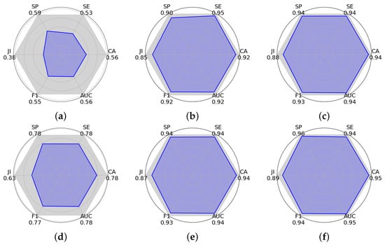 Comparative evaluation of various neural network architectures using Polygon Area Metric (PAM). The metrics were calculated using the average confusion matrices from Figure A2. The plots show six key performance indicators—Specificity (SP), Sensitivity (SE), Jaccard Index (JI), Accuracy (CA), Area Under the Curve (AUC), and F1-score—with PAM representing the blue shaded area inside each polygon. The larger polygon area indicates better overall performance according to PAM. (a) YOLOv8 (800). (b) PSR (800). (c) Our 3D model (800). (d) YOLOv8 (1000). (e) PSR (1000). (f) Our 3D model (1000).