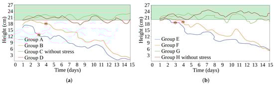 The images show the height variation in the foliage of our strawberry plants during the 15-day evaluation period. The maximum foliage height is 27 cm. The green area represents the without-stress threshold, and the red asterisks indicate the day when the plants exhibit visual signs of stress. Also, our method detected an average height of 20 cm in the foliage of plants from groups C and H. (a) Plants with water irrigation. (b) Plants with water irrigation and nutrients.