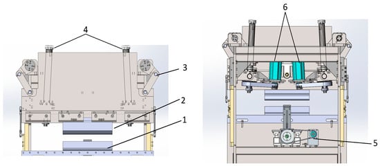 Diagram of the bending machine and component description; 1—lower mold; 2—upper mold; 3—connecting rod structure; 4—rollerscrews; 5—backstop motor; 6—slider motor.