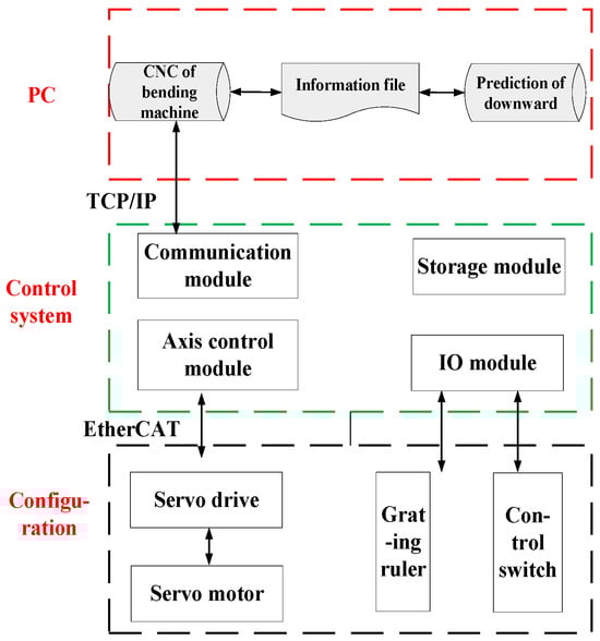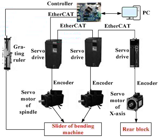 In the proposed design framework, the dedicated CNC system tailored for bending machines serves as the cornerstone, providing essential hardware resources and a robust data transmission interface. This hardware layer functions predominantly as a conduit for seamless data communication and conversion between the CNC processing zone of the bending machine and its structural system. The core components comprising this layer encompass the controller, an EtherCAT bus communication submodule, servo drivers, and servo motors, among others. The architecture of this system’s hardware configuration is illustrated in Figure 3, which provides a visual representation of the key elements and their interconnections.