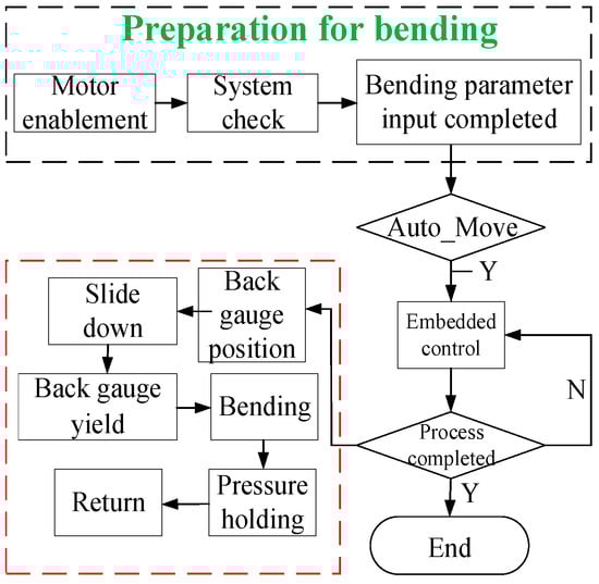 In this context, we primarily focus on comparing the MAX parameters, as the system’s real-time capability is dictated by the peak delay time. By scrutinizing the test outcomes before and after the application of the real-time patch, it is evident that the maximum delay is significantly reduced from 213 μs to 76 μs. This substantial decrease underscores the enhancement of the real-time system, effectively meeting the stringent performance requirements. Compared with the traditional CNC bending system, this one, developed based on soft PLC, has the advantages of low costs and good integration. Additionally, the motion controllers developed based on ARM boards have abundant onboard resources and can integrate machine learning, computer vision, and other functions, with good potential for future development. Then, to achieve complete control of the developed embedded system, a diagram comprising the bending process and embedded control is presented in Figure 5.