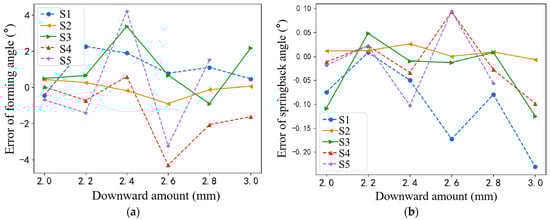 As evident in Figure 11, S2 stands out among the five simulation sets, exhibiting a close correspondence with the experimental outcomes. Specifically, the maximum molding angle error for S2 is a minimal 0.905°, while the rebound angle error remains negligible, at 0.026°. Consequently, the meshing approach employed in S2 is deemed optimal for subsequent experimental endeavors. This validates the accuracy of the finite element model, as S2’s results approximate real-world values with minimal deviations. Thus, the simulation data generated from this model can confidently serve as a surrogate for actual bending data in subsequent analyses and operations.