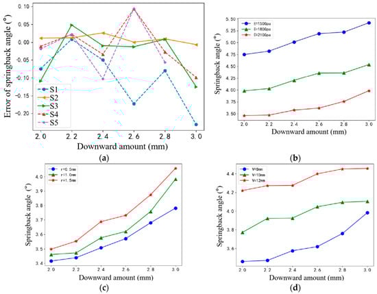 Figure 12 illustrates a trend where the bending springback angle of the sheet metal workpiece increases with an increase in the downward amount applied by the bending machine. When comparing simulations across various sheet thicknesses, it is observed that thicker sheets exhibit smaller springback angles, with the springback diminishing further as the downward amount intensifies. Similarly, simulations with a higher elasticity modulus demonstrate a decrease in the springback angle, indicating a positive correlation. Conversely, an increase in the radius of the upper die leads to augmentation in the springback angle. Additionally, simulations with wider lower slot opening widths also exhibit an upward trend in the springback angle, reiterating the influence of die geometry. The key findings are as follows: springback diminishes with thicker sheets and higher downward amounts, a higher elasticity modulus results in reduced springback, and a larger radius of the upper die and wider lower slot opening widths both contribute to increased springback.