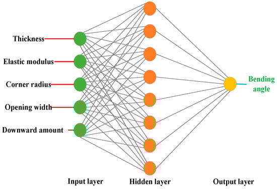 BP network modeling is performed with various numbers of hidden layer nodes, and their corresponding prediction performances are subsequently compared. The outcomes of this comparative analysis are succinctly presented in Table 6, highlighting the key differences and insights. In this neural network model, five inputs of thickness, elastic modulus, corner radius, opening width, and downward amount are considered with only one output of bending angle. Under these circumstances, the amount of data samples are appropriate for training and testing in the industrial applications.