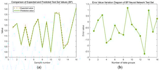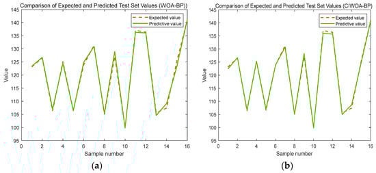 The predictive outcomes derived from the base WOA-BP prediction model are presented in Figure 15a, whereas the refined results obtained after improving the WOA-BP prediction model are showcased in Figure 15b.