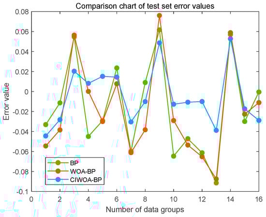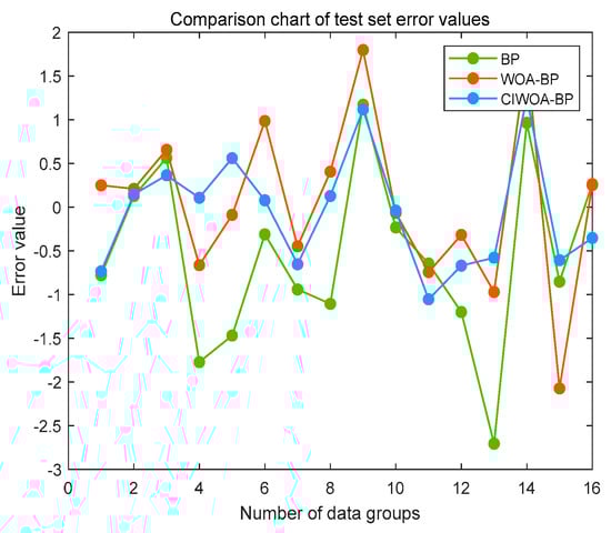Three distinct prediction models are constructed, each utilizing the basic BP neural network, the WOA-BP neural network, and the improved WOA-BP neural network, respectively, to forecast the downward amount. The predictive accuracy of these three models is then compared, with their prediction errors illustrated in Figure 17.