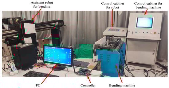 To validate the practicality of the bending control system devised in this study, an integrated bending work system was assembled utilizing the existing bending auxiliary robot housed within the laboratory environment. The experimental configuration is depicted in Figure 18.