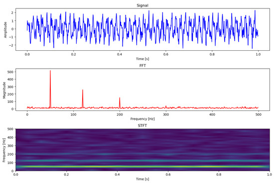 Comparison of each domain of vibration input in deep learning (top: signal domain, middle: frequency domain, bottom: time–frequency domain).