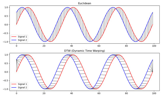 Example of distance comparison using Euclidean distance and DTW algorithm.