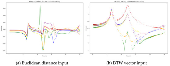 The reference state is defined as the steady state immediately after the power plant begins operation. Since real abnormal data are not available for this study, we use simulation data. In this simulation, data obtained under optimal clamping force conditions are designated as the reference data. The deep-learning model calculates the DTW distance between the reference data and new data. Instead of using DTW solely for distance calculation, we create a vector where each matched point has the normal data point as its origin and the new data point as its destination. This method allows for the inclusion of both the direction and magnitude of change in the training process. Figure 6 shows the difference between Euclidean distance and DTW vector comparison for normal and abnormal data. The utilized sensor data were collected from the eight sensors located at the top. In the plots, the lines in different colors represent the values from different sensors. The plot on the left visualizes the Euclidean distances of the sensor values in a normal state, while the plot on the right illustrates the matched vectors using dynamic time warping (DTW). By using DTW-based change rates as input, the algorithm can assess frequency changes even when baseline conditions vary, ensuring robust performance.