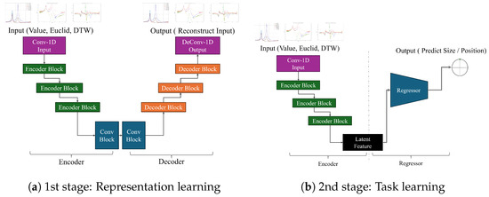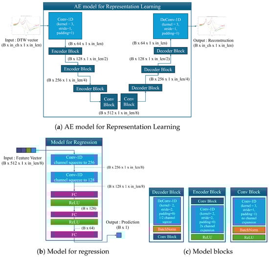 The model used in our experiments comprises two main components. The first is an autoencoder (AE) for feature extraction and representation learning, and the second is a regressor for making predictions based on these features. As shown in Figure 8, the AE model on the left includes three blocks: a Conv block, an Encoder block, and a Decoder block. The Conv block extracts features while maintaining the length and dimensionality of the input data. It performs a 1D convolution with a kernel size of 3, stride 1, and padding 1, followed by batch normalization and ReLU activation. The Encoder block reduces the length and doubles the dimensionality using a convolution of length 2, stride 2, with ReLU activation. In the Decoder block, we use a deconvolution operation to double the length and halve the dimensionality, then concatenate this output with the tensor from the Encoder block. Batch normalization and a final Conv block further refine the features. The Encoder and Decoder blocks are designed to perform complementary operations.