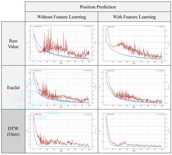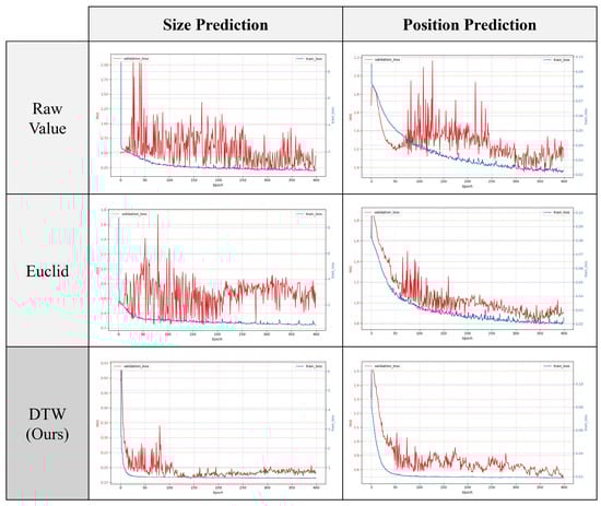 The experimental results indicate that validation loss varies less when predicting the position of clamping force degradation compared to predicting its overall size. This suggests that position prediction is less susceptible to overfitting, leading to more stable learning. For the validation loss, DTW exhibits the least variation, demonstrating stability and quick convergence, which supports the superiority of DTW in the learning process.