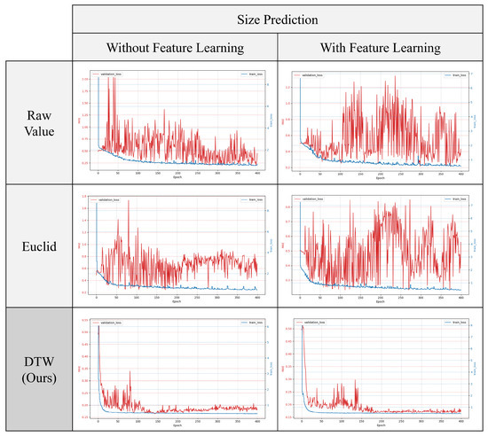 In this study, we assessed the effectiveness of the proposed AE-based representation learning, followed by downstream task learning. Using the same setup as the previous experiment on input effects, we conducted six training and validation experiments. These included an experimental group that applied AE-based pre-training for each of the three inputs and another group that did not apply pre-training. Figure 10 and Figure 11 show the changes in loss for both groups. Figure 10 displays the loss reduction in predicting preload size, while Figure 11 shows the loss reduction in predicting preload location. In both graphs, the red line represents validation loss and the blue line represents training loss.