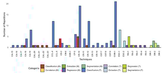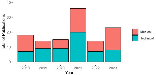During this phase, we outline research questions, keywords, and related synonyms, as well as search strings for MS and TS compilation. For the purpose of systematic mapping, we applied three inclusion criteria and three exclusion criteria simultaneously along with the terms identified in PICOS. The criteria used in SM for the review of TS provided 2896 studies, while for MS, the figure was 3847 studies. These data were collected from six repositories, as detailed in Table 4. For the systematic literature review of TS, we employed six inclusion criteria and three exclusion criteria, which were organized into phases (F). In F1, we applied CeSR1 and CeSR2, resulting in a total of 796 excluded studies. F2 included CiSR1 and CiSR5, resulting in 340 studies. In F3, we included CiSR2 and CiSR3, resulting in a total of 133 studies. For F4, we included CiSR6 and CiSR7, totaling 60 studies. For systematic literature reviews of medical studies, we used seven inclusion criteria and three exclusion criteria organized into phases (F). In F1, we excluded CeSR1 and CeSR2, resulting in a total of 1180 excluded studies. In F2, we included CiSR1, CiSR4, and CiSR5, providing 438 studies. In F3, we included CiSR2 and CiSR3, resulting in a total of 230 studies. Finally, 60 studies were included in F4, CiSR6, and CiSR7. Table 4 concisely summarizes all of these details. The analysis produced 120 studies with an equal distribution of 60 in TS and 60 in MS. Figure 1 provides a visual summary of the publication distribution per year, showing that the majority of studies were conducted in 2021, contributing 30% of the total 120 publications. Furthermore, it is evident that the years 2018 and 2023 represent approximately 15% and 19.17%, respectively. Similarly, the years 2019, 2020, and 2022 made comparable contributions, each representing between 11.67% and 12.5% of the total studies. The analysis of the 120 publications shows that 65.83% belong to Q1 journals (79), followed by 25.83% in Q2 (31), 5% in Q3 (6) and 0.83% in Q4 (1). In addition, 2.5% (3) are conferences. This indicates a significant predominance of high-impact publications in Q1 with a lower representation of conferences within the distribution.
