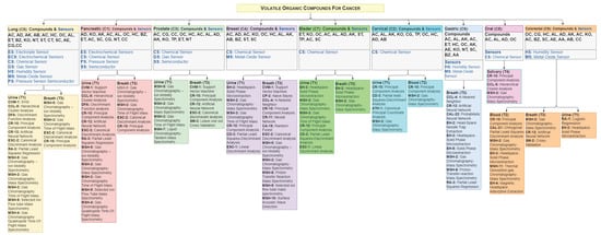 The study encompasses 120 investigations that identify 20 categories of VOCs distributed across 9 types of cancers. These categories are organized visually in Figure 2. The components are extracted from urine, breath, saliva and blood biomarkers using 110 sensors and 22 medical devices. Additionally, they are analyzed through 34 techniques, including segmentation, feature extraction, correlation, regression, and classifiers.