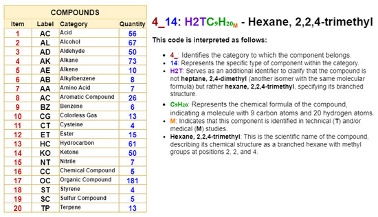 To provide additional clarity on the labeling process, refer to the example illustrated in Figure 4; 4_14: corresponds to the compound hexane, 2,2,4-trimethyl and is structured so that each part provides specific information about the component. The prefix 4_ identifies the general category of the component, while 14 indicates its specific type within that category. The section H2T acts as a key identifier to clarify that the compound is not heptane, 2,4-dimethyl (another isomer with the same molecular formula) but hexane, 2,2,4-trimethyl, highlighting its unique branched structure. The formula C9H20 represents the chemical composition of the compound, with nine carbon atoms and 20 hydrogen atoms. Finally, M indicates that this compound has been identified in technical (T) and/or medical (M) studies. This coding system ensures precise description and avoids confusion between isomers sharing the same molecular formula. By employing this systematic approach, the study introduces a structured and precise nomenclature that simplifies the organization, interpretation, and analysis of the VOC-related data. This framework not only enhances the clarity of the study but also helps the reader better understand the diversity and detailed distribution of the chemical components.