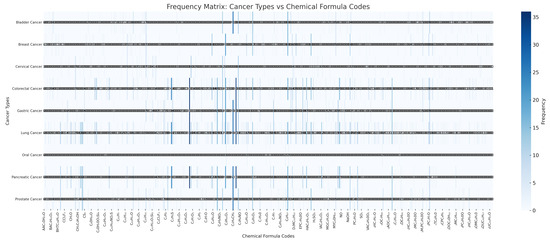 The chart displays a frequency matrix that connects cancer types (vertical axis) with chemical formulas (horizontal axis). Each cell represents the frequency of association between a specific cancer type and a chemical formula, indicated by the intensity of the blue color scale. Rows correspond to specific cancer types, while columns represent coded chemical formulas. This format helps identify patterns and notable relationships, such as formulas highly associated with certain cancer types or cancer types sharing multiple formulas.